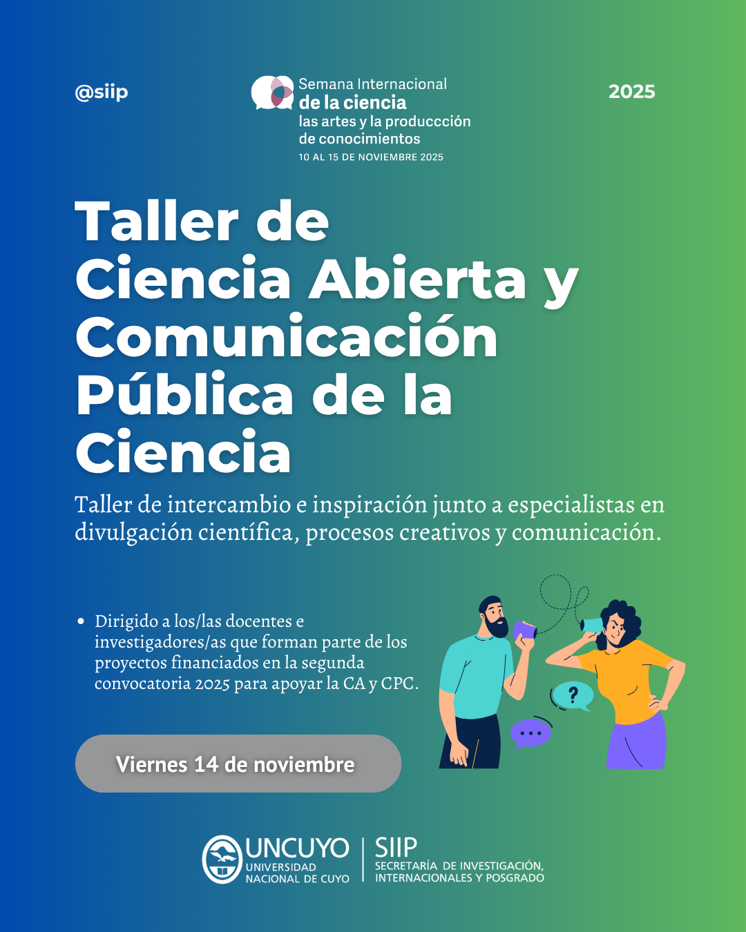 La Secretaría de Investigación, Internacionales y Posgrado (SIIP) de la UNCUYO invita a los equipos ganadores de la segunda convocatoria 2025 de Ciencia Abierta y Comunicación Pública de la Ciencia a participar de un taller de encuentro e intercambio. La actividad busca fortalecer las capacidades de los proyectos para comunicar la ciencia de manera innovadora, participativa y efectiva, promoviendo la colaboración y el aprendizaje conjunto.