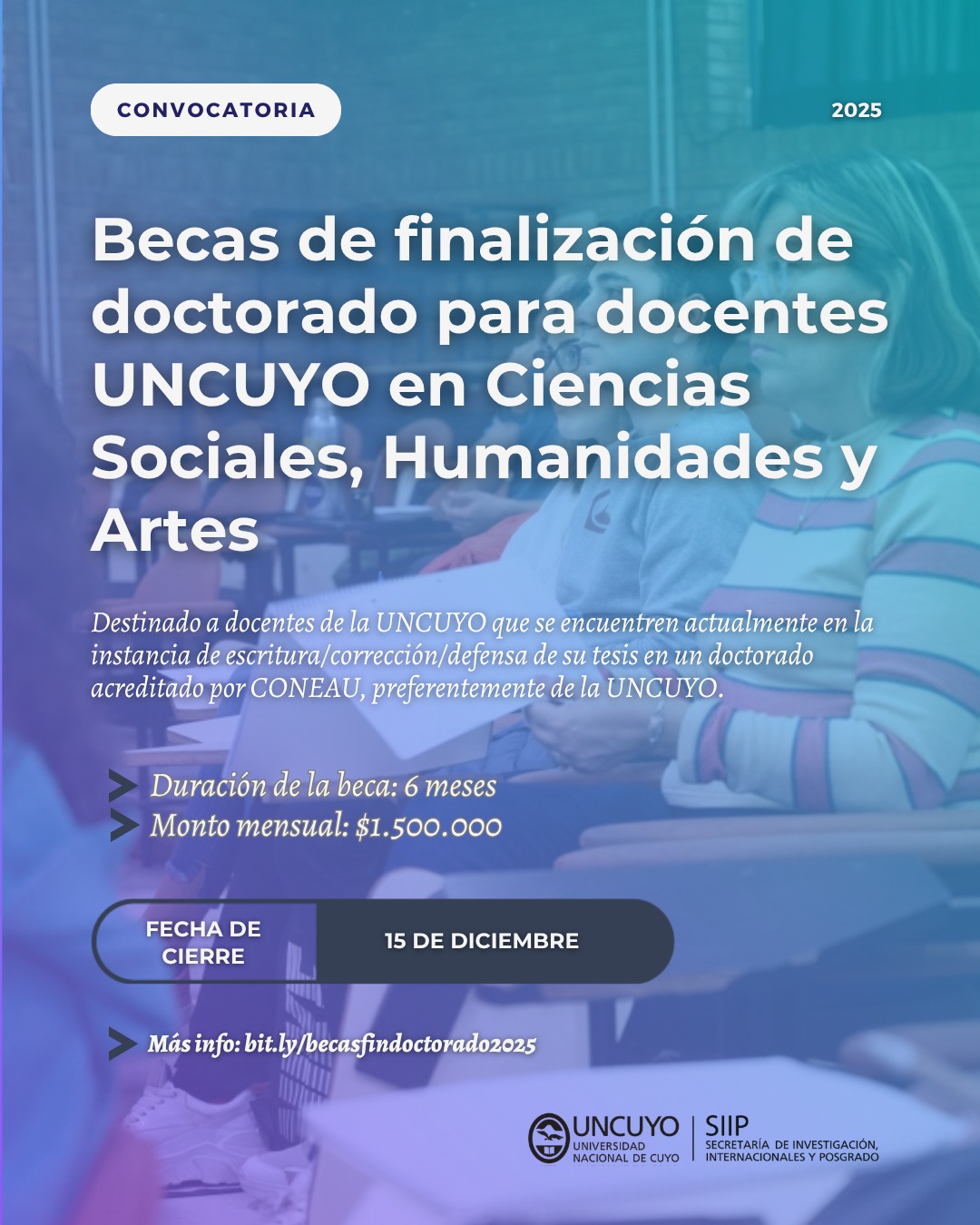 La Secretaría de Investigación, Internacionales y Posgrado (SIIP) de la Universidad Nacional de Cuyo presenta una nueva convocatoria de Becas para la Finalización de Doctorado, destinada a docentes de la UNCUYO que se encuentren en la etapa final de redacción, corrección o defensa de su tesis doctoral.