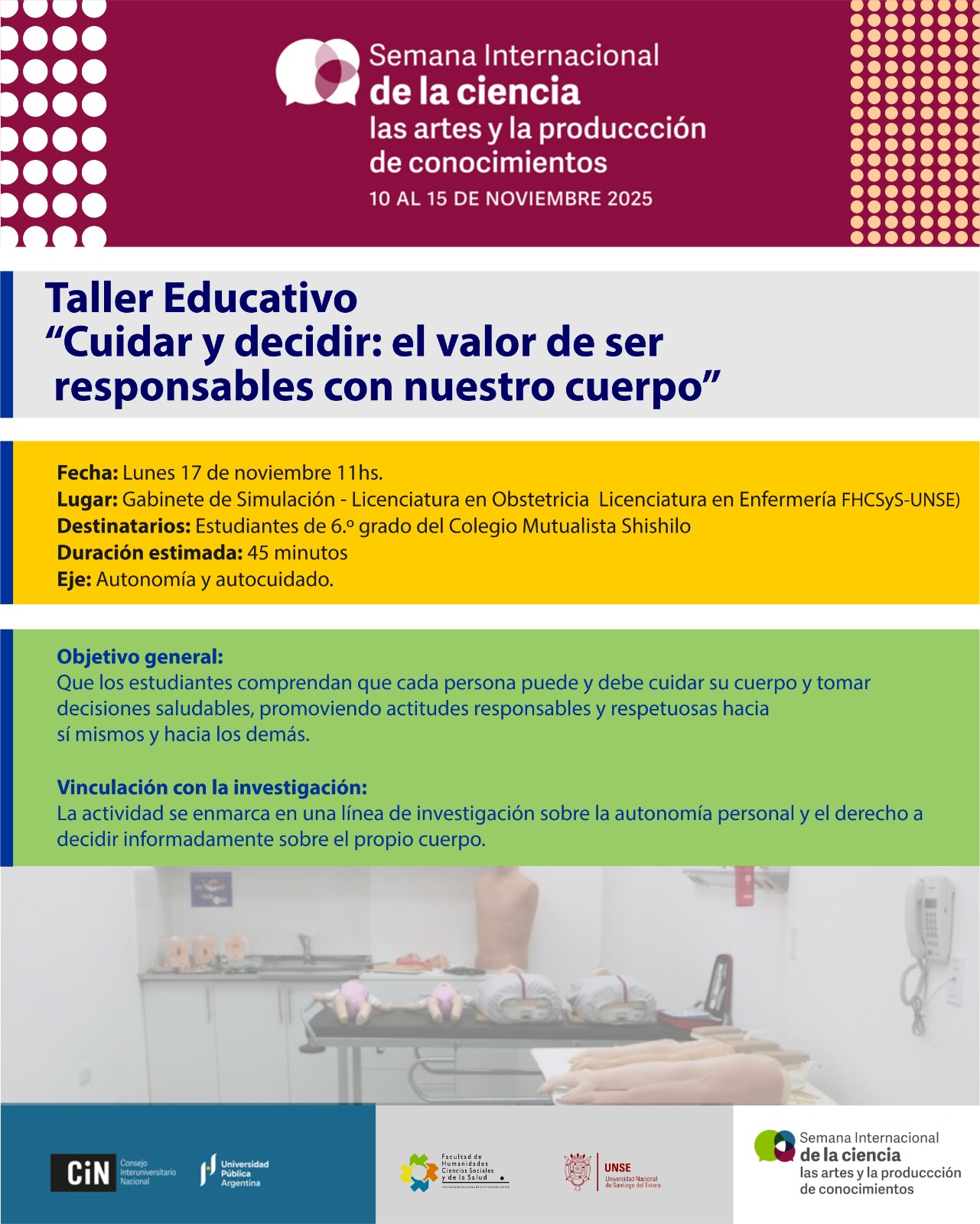 La Facultad de Humanidades, Ciencias Sociales y de la Salud de la Universidad Nacional de Santiago del Estero propone una visita guiada al Gabinete de Simulación Clínica de dicha facultad, destinada a alumnos de nivel primario. La actividad está centrada en el eje Autonomía y autocuidado; y tiene por objetivo general que los estudiantes comprendan que cada persona puede y debe cuidar su cuerpo y tomar decisiones saludables, promoviendo actitudes responsables y respetuosas hacia sí mismos y hacia los demás.