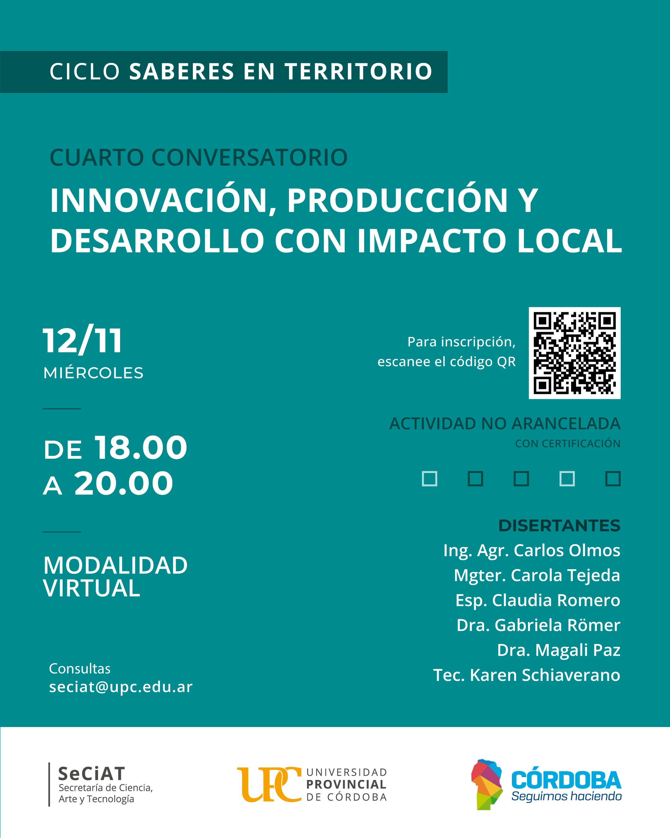 La Secretaría de Ciencia, Arte y Tecnología de la Universidad Provincial de Córdoba invita a participar del cuarto encuentro del ciclo Saberes en Territorio, un espacio de divulgación y diálogo que busca acercar a la comunidad universitaria los procesos y resultados de las investigaciones desarrolladas en la UPC y en articulación con otras instituciones.